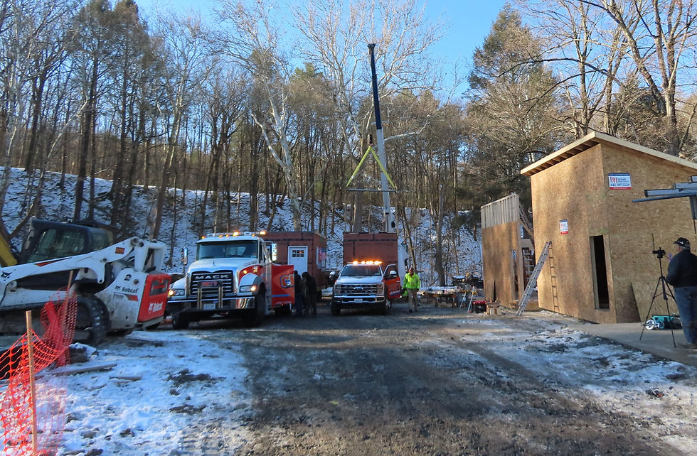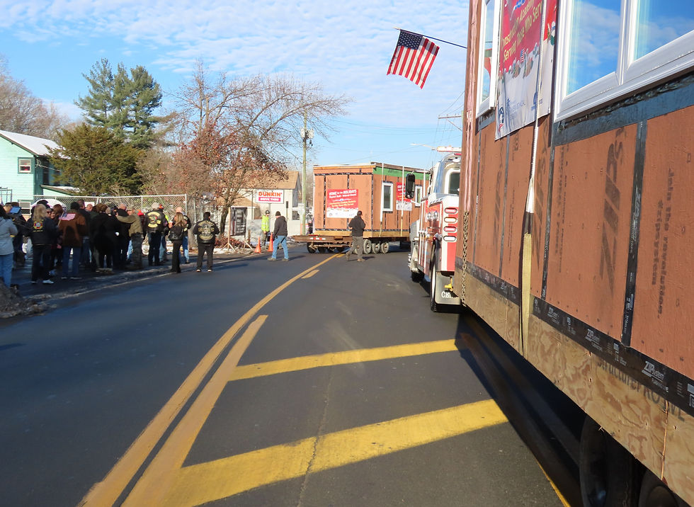 The students were transported by bus to Port Jervis to a waiting delegation of veterans, community groups, individuals, and patriotic music provided by members of the Broome Street Band in front of the Rumshock’s tiny home site. Flags waved as the tiny home was backed in and placed on its foundation.